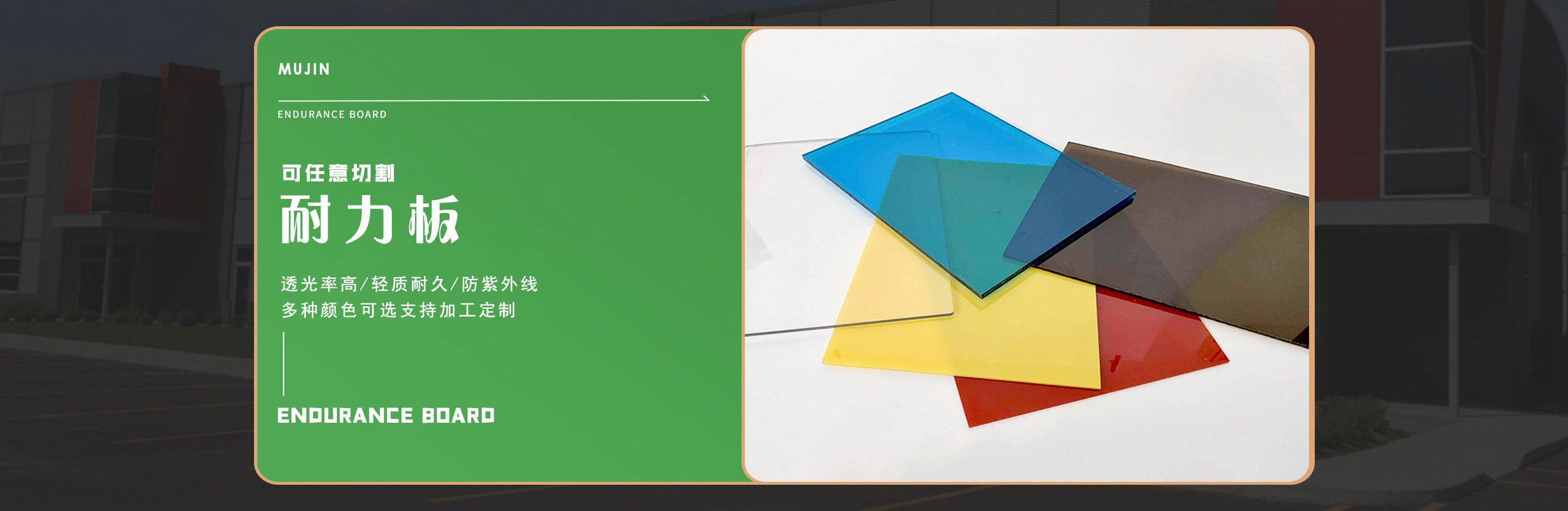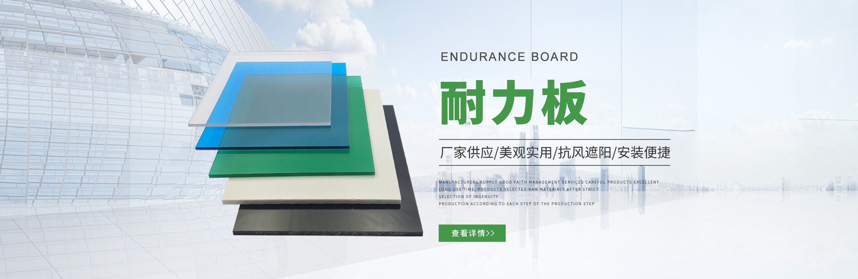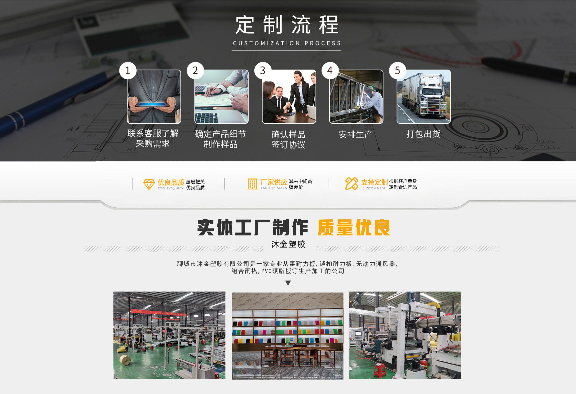 聊城市沐金塑膠有限公司注冊資金2180萬元,占地20000余平方,擁有自建廠房15000平方,員工100余名。10余年來,公司主營耐力板,鎖扣耐力板,耐力板深加工,無動力通風(fēng)器,組合雨搭,PVC硬脂板,耐力板廠家等板材的發(fā)展戰(zhàn)略,逐漸成長為綜合性企業(yè)?! 」緭碛卸鄺l板材共擠生產(chǎn)線,采用世界知名品牌進(jìn)口原材料和先進(jìn)工藝,依據(jù)完善的ISO9001質(zhì)量管理體系和ISO14001環(huán)境管理體系,為產(chǎn)品的卓越品質(zhì)提供了強有力的保證。憑借過硬的創(chuàng)新能力和堅實的硬件基礎(chǔ),贏創(chuàng)已成為國內(nèi)領(lǐng)先的熱塑性板材生產(chǎn)商,產(chǎn)品被廣泛應(yīng)用于建筑業(yè)、農(nóng)業(yè)、工業(yè)、廣告業(yè)、安防行業(yè)及DIY領(lǐng)域?! 」臼冀K致力于通過提供最優(yōu)的板材應(yīng)用解決方案,為客戶創(chuàng)造最高的價值;堅守創(chuàng)新、質(zhì)量、靈活、服務(wù)和速度的核心價值觀;堅持“完美的產(chǎn)品需要完美服務(wù)的支持”的經(jīng)營理念,努力實現(xiàn)成為世界領(lǐng)先的板材與解決方案供應(yīng)商的夢想。 在未來,公司將立足客戶需求,不斷改變和完善現(xiàn)有產(chǎn)品,拓展產(chǎn)品線和充分開發(fā)板材的應(yīng)用領(lǐng)域,為客戶創(chuàng)造全方位的價值。同時更好地實現(xiàn)員工的價值,實現(xiàn)公司團隊的價值。我們將與您一起創(chuàng)贏未來! 企業(yè)使命:成為世界領(lǐng)先的板材與解決方案供應(yīng)商?! 」驹妇埃和ㄟ^提供最優(yōu)的板材應(yīng)用解決方案,為客戶創(chuàng)造最高的價值?! 『诵膬r值觀:質(zhì)量...